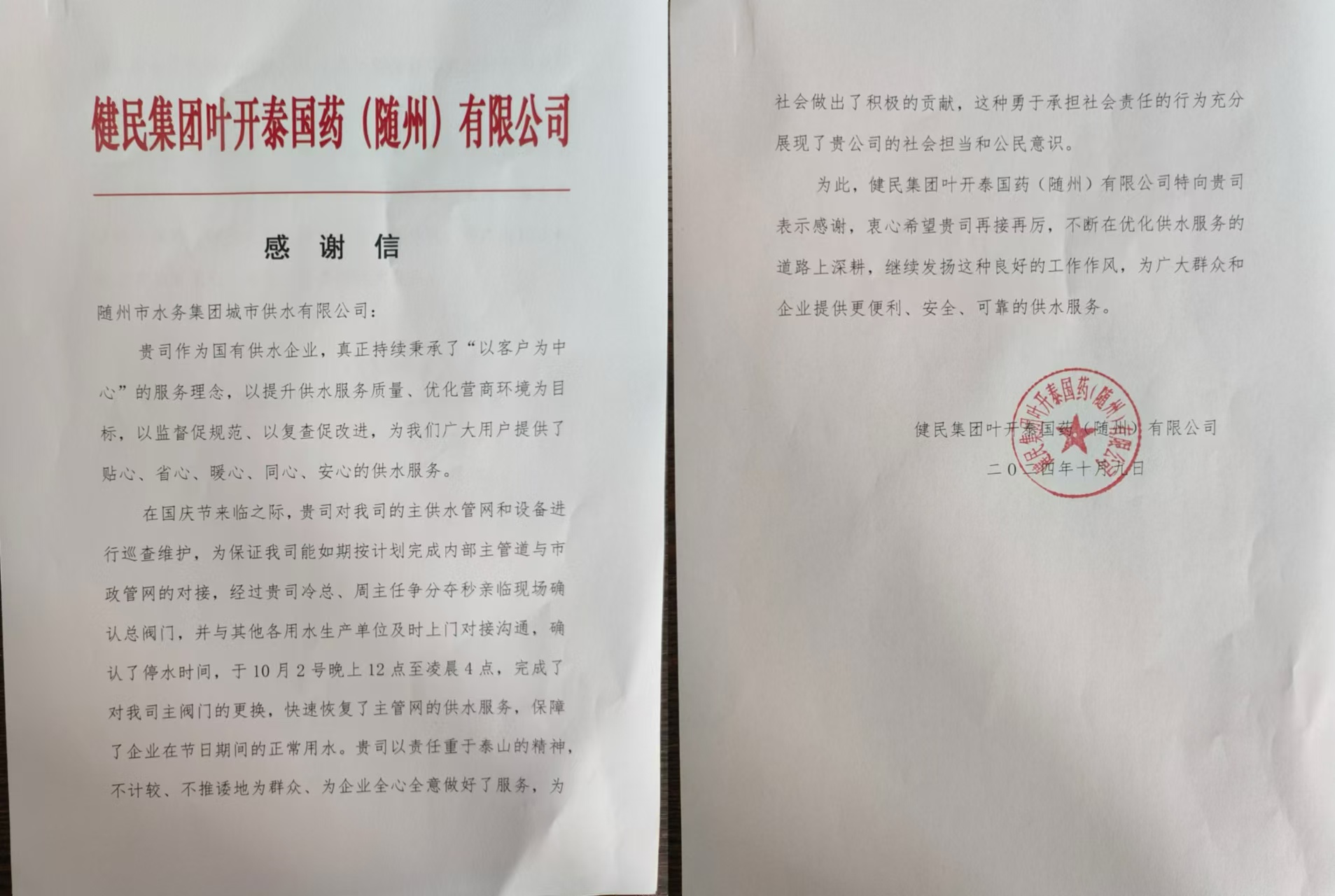 “排憂解難及時(shí) 供水服務(wù)周到”,近日,健民集團(tuán)葉開(kāi)泰國(guó)藥(隨州)有限公司專(zhuān)程到隨州市水務(wù)集團(tuán)下屬子公司城市供水有限公司送上一面承載誠(chéng)摯謝意的錦旗和一封感謝信,他們用最質(zhì)樸、最真摯的方式,對(duì)公司運(yùn)維人員熱情、高效、便捷、暖心的服務(wù)表示誠(chéng)摯感謝。