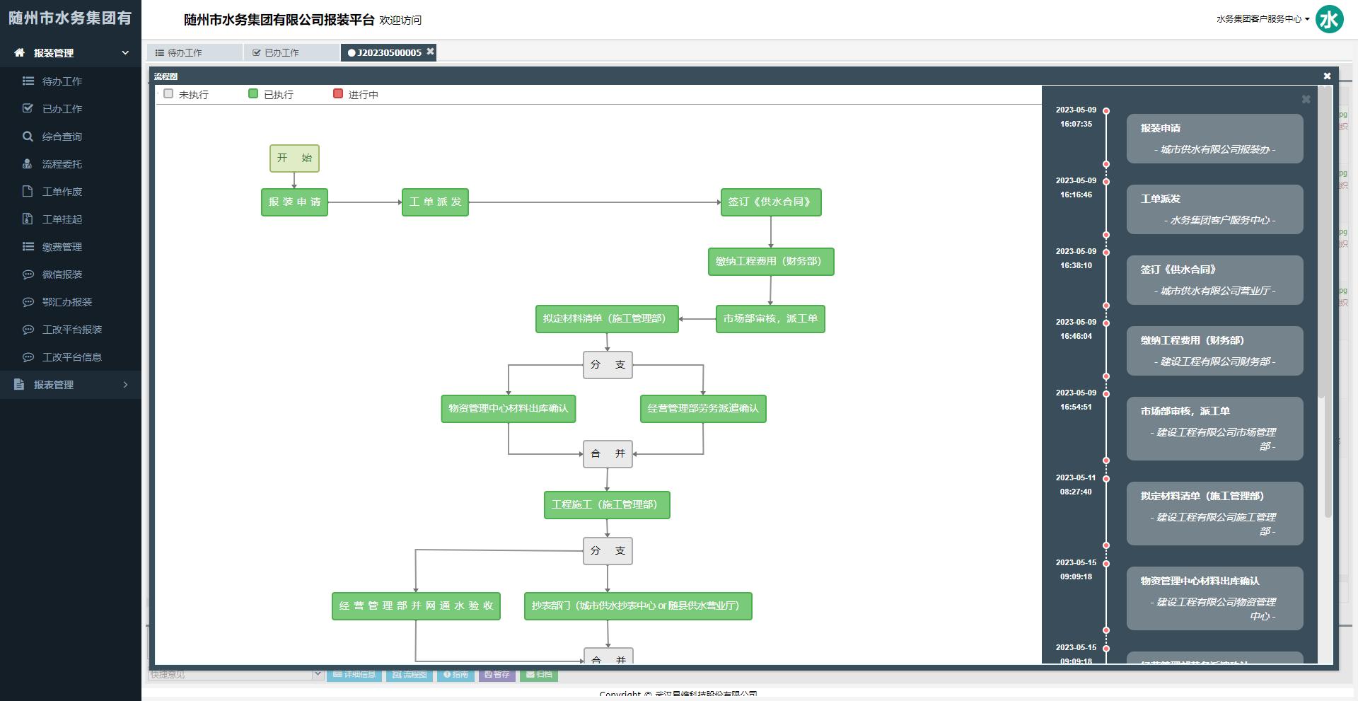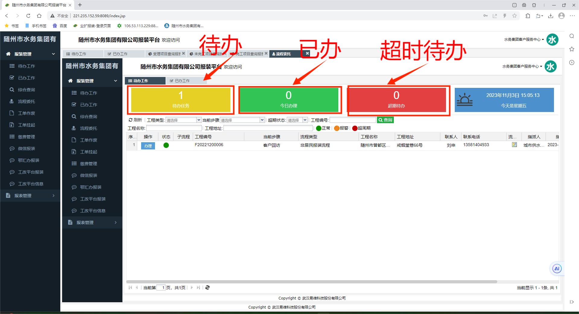 報裝業(yè)務(wù)管理系統(tǒng)通過流程監(jiān)測,對待辦,已辦,超時待辦的業(yè)務(wù)進行分別處理,保證業(yè)務(wù)有效流轉(zhuǎn),及時辦結(jié)。
