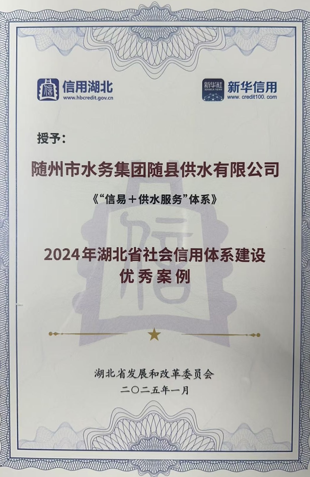 在2024年湖北省社會(huì)信用體系建設(shè)典型案例評選中,隨州市水務(wù)集團(tuán)有限公司憑借創(chuàng)新實(shí)踐項(xiàng)目《“信易+供水服務(wù)”體系》,成功榮膺全省優(yōu)秀案例獎(jiǎng)。這一殊榮既是對隨州水務(wù)集團(tuán)創(chuàng)新服務(wù)成效的認(rèn)可,更是為社會(huì)信用建設(shè)和營商環(huán)境優(yōu)化注入強(qiáng)勁動(dòng)能,進(jìn)一步激活創(chuàng)新發(fā)展新勢能。