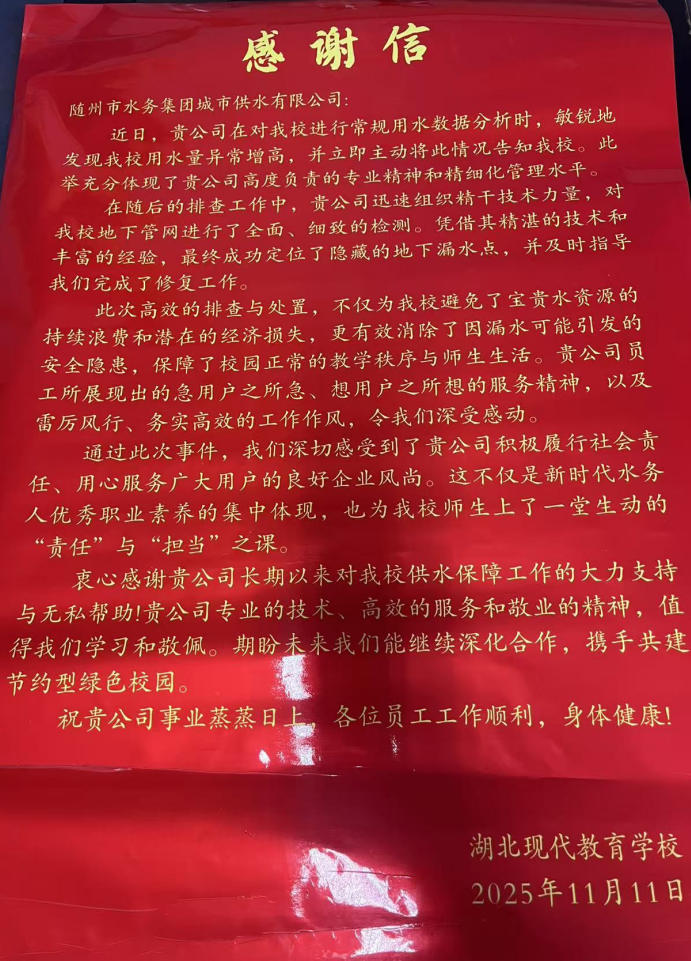 一面鐫刻著“明察秋毫堵漏點,傾心服務(wù)暖師生”的鮮紅錦旗,隨同滿載深情的感謝信,被湖北現(xiàn)代教育學校負責人鄭重送到隨州市水務(wù)集團城市供水公司。紙短情長,字里行間飽含對公司快速解決校園供水困境的誠摯謝意。